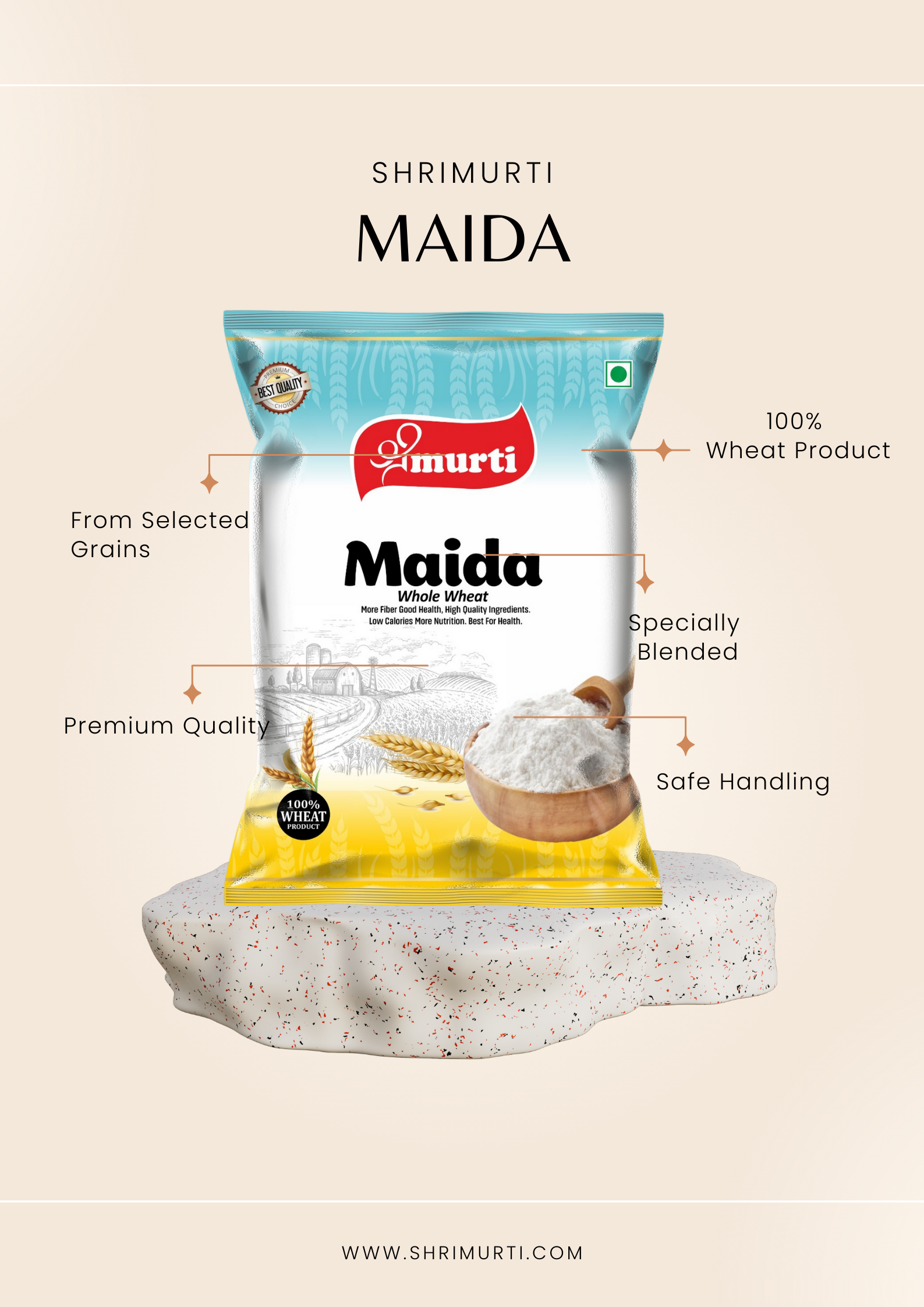 Maida, a finely refined wheat flour derived from the pure endosperm of wheat, is known for its exceptional texture and versatility. At Shrimurti, we ensure our maida is gluten-rich and produced from carefully selected, high-quality wheat varieties to deliver consistent performance and superior results. A staple across Indian and international cuisines, it is widely used in Indian kitchens to create an array of savoury delights such as samosa, kachori, naan, bhatura, kulcha, and mathri, as well as traditional sweets like jalebi, gujiya, and malpua, along with a variety of bakery products. Elevate your culinary creations with Shrimurti, crafted to enhance taste, texture, and quality in every recipe.